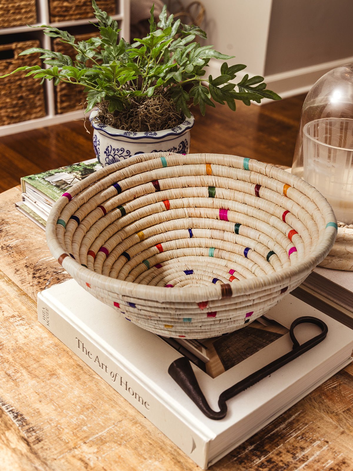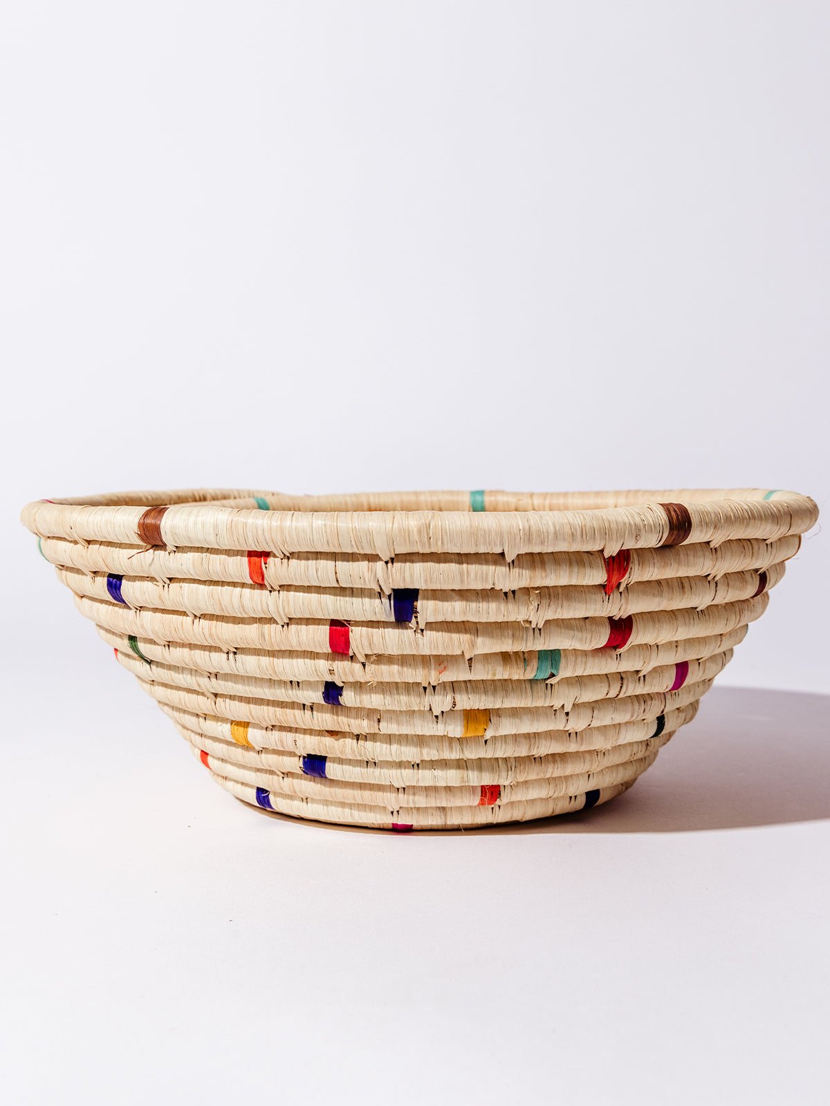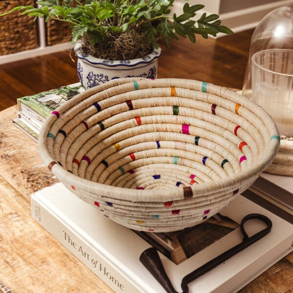 The Faith Woven Basket in Confetti is a joyful expression of craftsmanship and color. This vibrant basket is handwoven in Uganda using natural grasses. banana fibers. sisal straw. and other locally sourced materials. With playful pops of color and an organic texture. it adds beauty and meaning to any space. whether hung on the wall or used as a tabletop fruit basket. Each basket is a celebration of hope. creativity. and opportunity. supporting women artisans through dignified